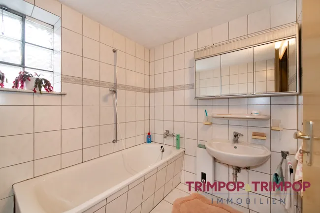 BAD HOCH 2 In diesem Haus finden Sie im Erdgeschoss ein Badezimmer mit Wanne, Waschbecken und Fenster. Ebenfalls finden Sie im Erdgeschoss das Gäste-WC. Im Obergeschoss wartet ein weiteres Badezimmer mit Dusche, Waschbecken, WC und Fenster. Die Bäder könnten eine Frischzellenkur vertragen.