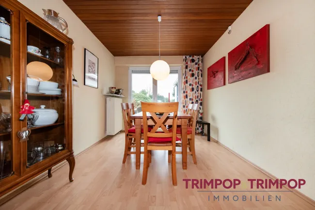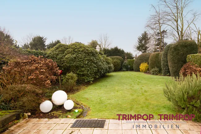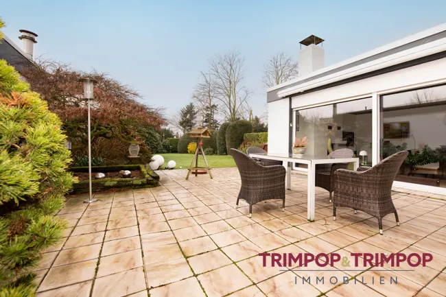 SO WOHNEN SIE HIER: Empfangen werden Sie durch eine geräumige Diele, von wo aus Sie das ca. 40 m² große Wohn-/Esszimmer erreichen. Die große Fensterfront mit Ausblick und Austritt auf die nach Westen ausgerichtete Terrasse lässt viel Licht herein und sorgt zusammen mit dem Parkettboden für eine luftige und heimelige Atmosphäre. Der Kamin sorgt an kühlen Abenden für zusätzliche Gemütlichkeit. An die Terrasse anschließend befindet sich der schöne und mit viel Liebe gepflegte Garten. Hier scheint nicht nur optisch den ganze Tag die Sonne, die Westausrichtung sorgt fast von morgens bis abends für reichlich Sommergefühle.