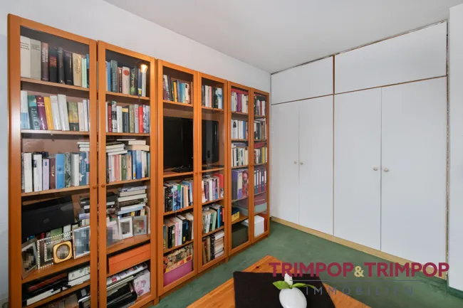 Bodenbeläge: * dunkelgrüner Fliesenboden im Eingangsbereich * Echtholzparkett im Wohn-Esszimmer * weißer Fliesenboden in der Küche * Laminatboden im kleinen Flur und einem Zimmer * grüner Teppichboden im Schlafzimmer und Kinderzimmer/Büro *
