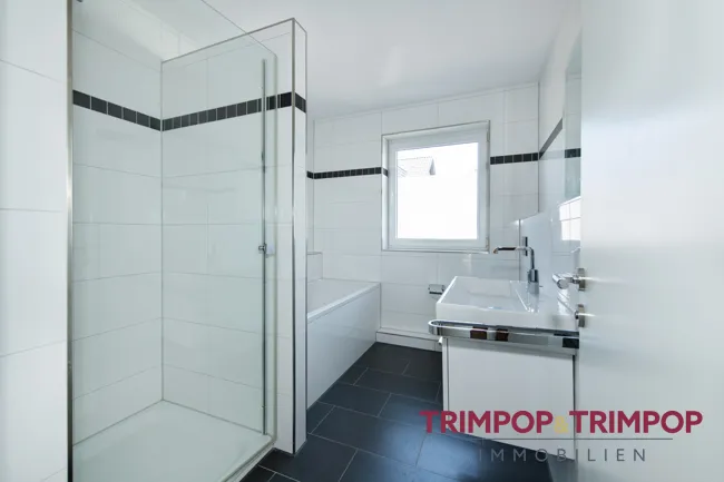 DAS BADEZIMMER mit Tageslicht hat eine Dusche, eine Badewanne, eine Handtuchheizung, ein Fenster, ein WC und selbstverständlich ein Waschbecken. Es gibt dunklen Fliesenboden und weiße Kacheln, die bis zur Decke reichen. Im Erdgeschoss, rechts neben der Haustür, haben Sie außerdem ein Gäste-WC mit Fenster.