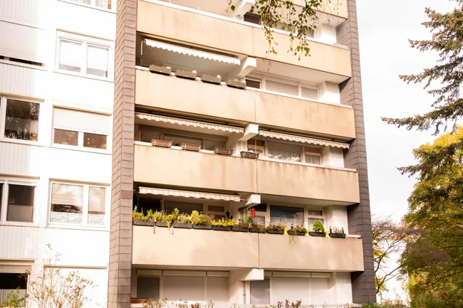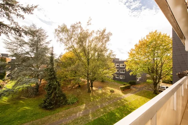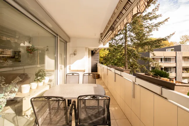 Vom Wohn-Esszimmer aus haben Sie noch mehr Sonne, da wartet nämlich der große Süd-Balkon. Die Markise entlang des Wohnzimmers und des Elternschlafzimmers ist ein willkommener Schattenspender an besonders heißen Tagen. Der Blick vom Balkon geht ins Grüne.