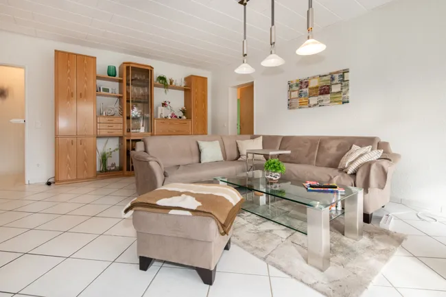 - heller Fliesenboden in der Diele, Wohn-Esszimmer, Küche, Bad und Gäste-WC. Teppichboden in den Schlafräumen