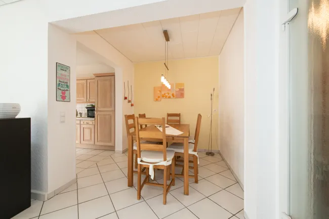 Die Böden in der Diele, im Wohn-Esszimmer und in der Küche sind mit schönen hellen Fliesen belegt. Die Schlafräume mit einem Teppichboden.
