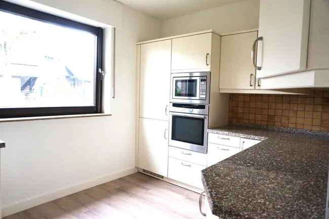 - Einbauküche mit Einbaumöbeln und folgenden Elektrogeräten: Induktionsherd, Dunstabzug, Backofen in Bequemhöhe, Mikrowelle, Kühl-Gefrierschrank.