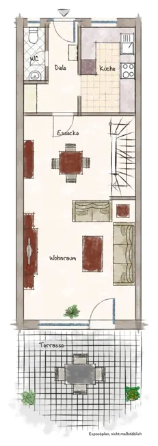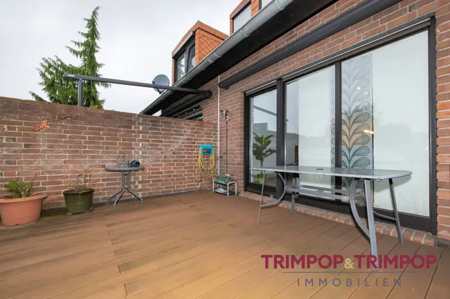 Durch die Terrassentür erreichen Sie Ihre große neue Terrasse. Hier können Sie es sich den ganzen Tag gut gehen lassen und die Sonne genießen. Die Markise ist ein willkommener Schattenspender an besonders heißen Tagen. Sie ist, auch das verhindert Schweißausbrüche, elektrisch.