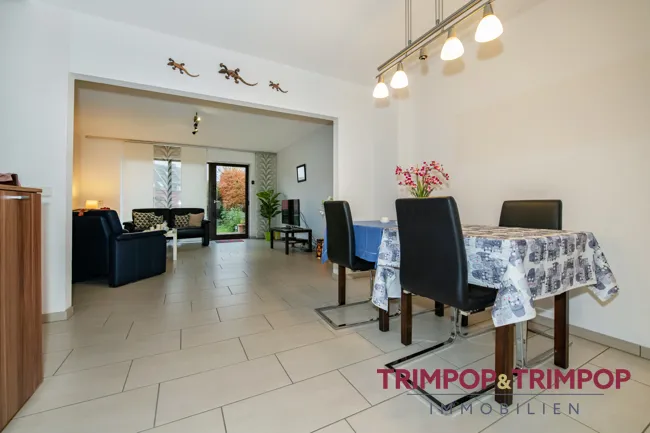 Durch die großen Fensterscheiben fällt viel Licht ins Wohn-/Esszimmer. In dieser Etage wurde vor etwa 10 Jahren ein neuer, beigefarbener Fliesenboden gelegt. Und diese Fliesen müssen nicht kalt sein. Im Wohn-/Esszimmer treten sie mit Fußbodenheizung auf und geben dem Raum Wärme und Behaglichkeit im Winter und eine angenehme Coolness an warmen Sommertagen.