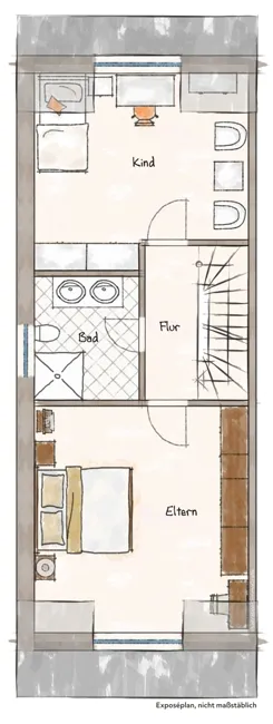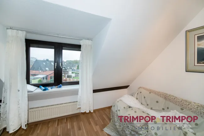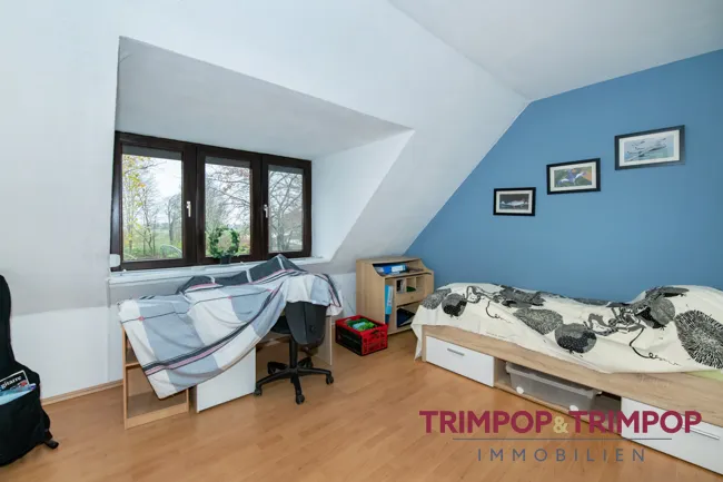 Das vierte Zimmer wartet im Spitzboden. Ein Raum mit großen Dachflächenfenster und einem Blick über das Geschehen, einen Raum, den ich für mich gerne als Arbeitszimmer hätte; meine Kollegin als Schlafzimmer für sich selbst und mein Neffe als sein privates Reich. Über 16 m² zum Drum streiten. Aber das entscheiden Sie.