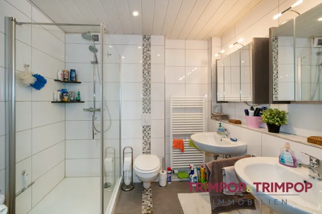 Sanitär: neues Badezimmer von ca. 2011 mit Dusche, Doppelwaschbecken und WC.