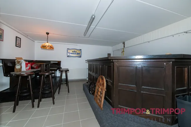 Im Hobbyraum steht eine große Thekenanlage und eine Eckbank mit Tisch und Hockern.