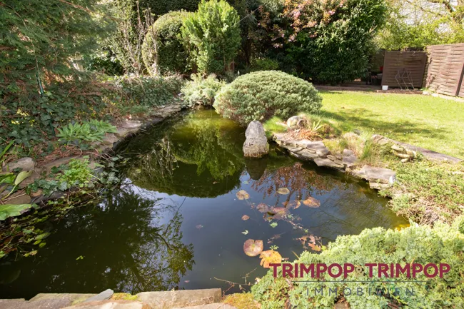 Das Haus hat einen kleinen Garten. Umrahmt wird er von Büschen und Sträuchern, die Ihnen Privatsphäre schenken. Extra: ein Gartenschuppen für die grünen Geräte. Ein hübscher Teich gehört auch noch dazu. Und wenn es wirklich mal ganz heiß ist, kann man auch seine Füße darin baden.