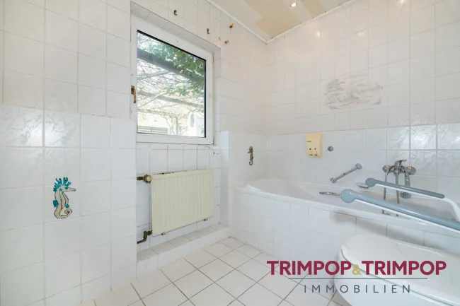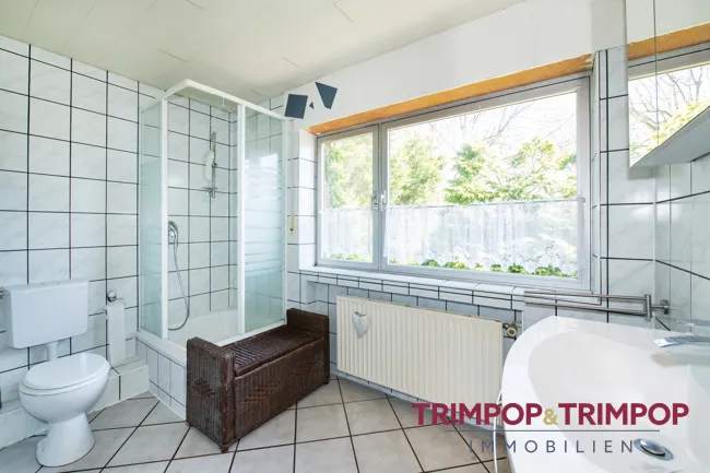 Bad: Badezimmer (mit Fenster) mit Wanne im Erdgeschoss, Badezimmer (mit Fenster) im 1. Obergeschoss mit Wanne und Dusche, Gäste-WC (älter) im Erdgeschoss.