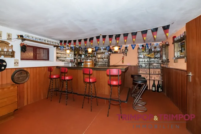 Untergeschoss: neben Heizungs- und Waschraum, großer Hobbyraum mit Barbereich.