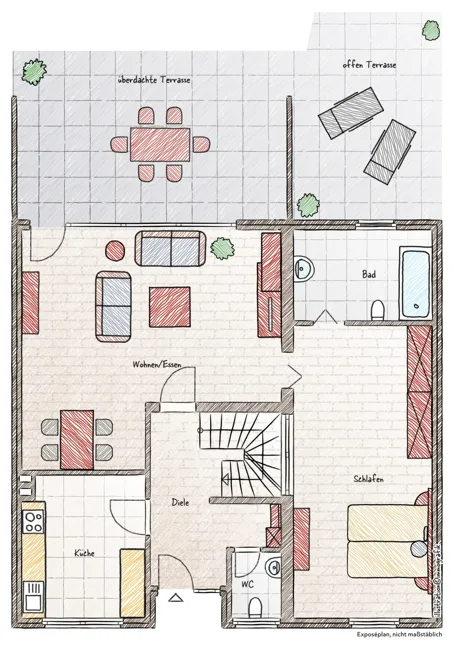 Aufteilung: Erdgeschoss: Diele, Gäste-WC, Küche, Wohn- Esszimmer, Schlafzimmer und Wannenbad (beides im