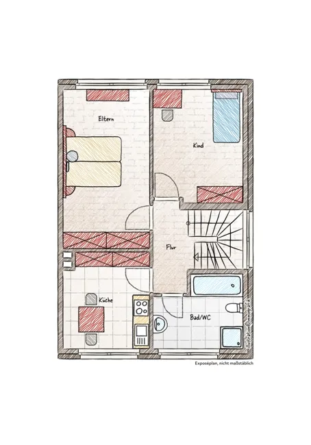 1.Obergeschoss: Diele, Küche, Bad, Elternschlafzimmer und Kinderzimmer und im Dachgeschoss Wohnzimmer.