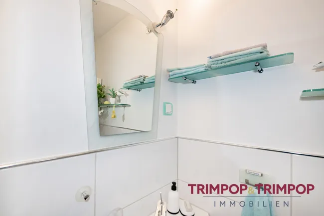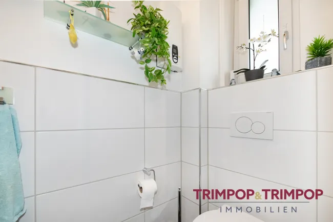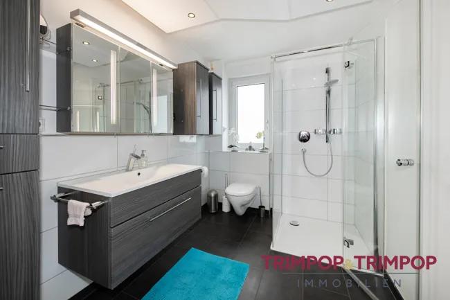 Bad: * Tageslichtbad mit Dusche im Obergeschoss * Gäste-WC im Erdgeschoss * im Jahr 2012 erneuert * weißer Fliesenspiegel mit anthrazitfarbenem Fliesenboden *