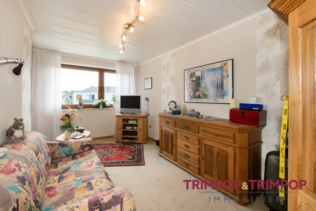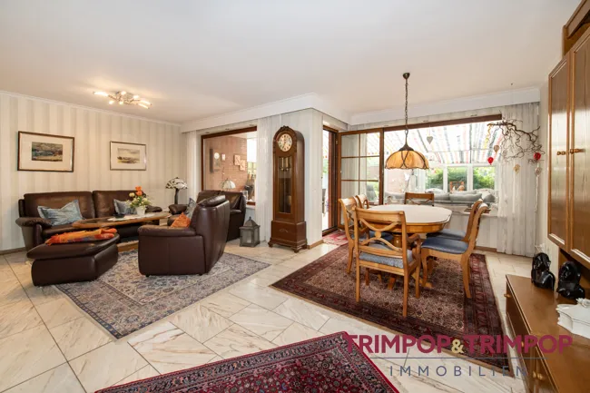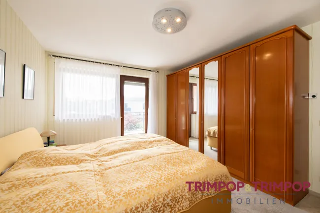 Das Wohnzimmer ist luftig und hell mit großer Fensterfront, der Ausblick und Austritt auf die nach Südwesten ausgerichtete Terrasse mit angrenzendem Garten ist natürlich inbegriffen.