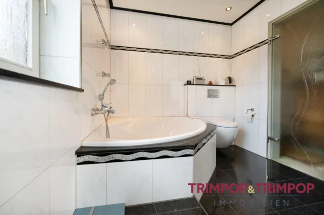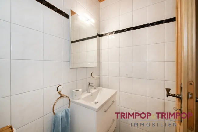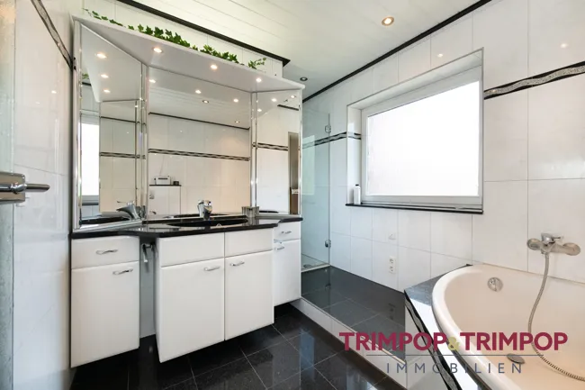 WELLNESS: Tageslichtbad mit Eckbadewanne, Dusche, Waschbecken und WC. Für den Besuch gibt es, wie es sich gehört, ein separates Gäste-WC im Erdgeschoss. Im Keller befindet sich eine Sauna und eine separate Dusche.