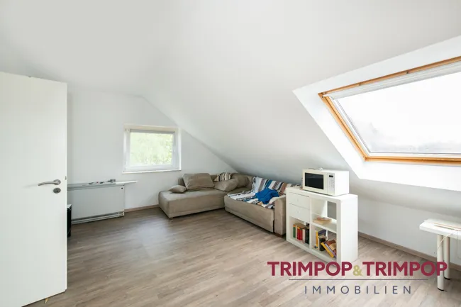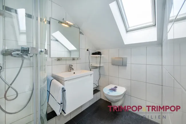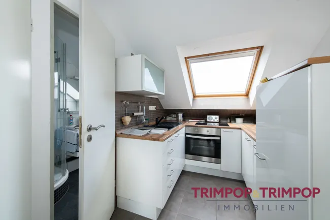 EXTRA: Wohnlich ausgebaute Nutzfläche im Dachgeschoss mit Küche, Tageslichtbad mit Dusche und zwei Räumen.