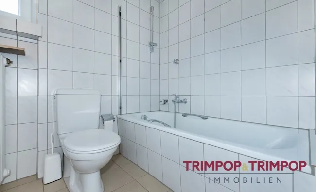 DAS BADEZIMMER mit Tageslicht hat eine Badewanne und selbstverständlich ein Waschbecken. Es gibt weiße Wandfliesen, die hoch verlegt wurden und beigefarbene Bodenfliesen. Im Erdgeschoss, links neben der Haustür, haben Sie außerdem ein Gäste-WC. Alles was man so braucht in einem Bad, ist da und tut seinen Dienst. Sicherlich sollten Sie die Bäder und auch die Wasserleitungen in Ihr Sanierungsbudget mit einrechnen.
