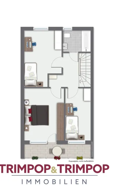 Das dritte geht nach vorne raus. Alle Schlafräume im Obergeschoss haben keine Schrägen.