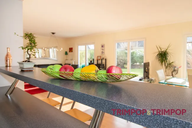 Über die großzügige Flügeltüre betreten Sie das große Wohn-Esszimmer. Die Küche ist offen. Der Inbegriff moderner Raumgestaltung, kommunikativ und großzügig. Auch beim Kochen und Aufräumen können immer alle zusammen sein, plaudern, Spaß haben und genießen.