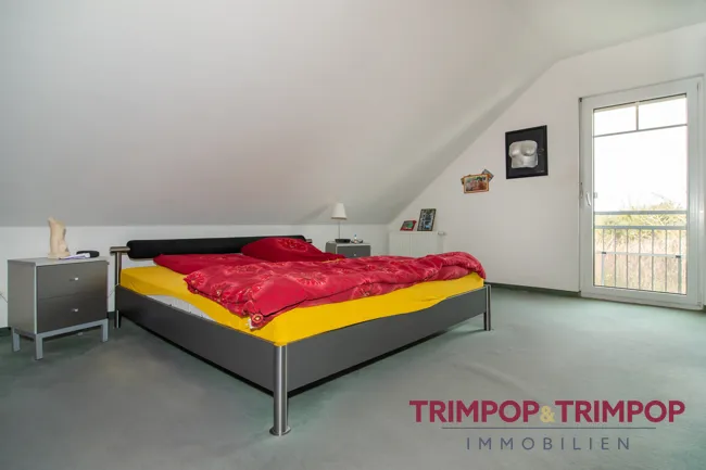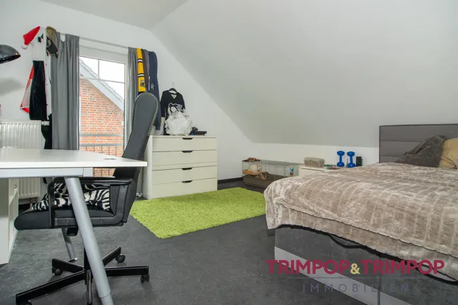 Drei weitere Zimmer liegen im Dachgeschoss mit nur leichten Schrägen. Die Kinderzimmer sind wirklich sehr großzügig und haben über 19 bzw. über 17 Quadratmeter Wohnfläche. Das geräumige Elternschlafzimmer hat über 22 Quadratmeter. Die Fußböden in den Schlafräumen sind mit weichem Teppichboden in dezenten Tönen ausgestattet.