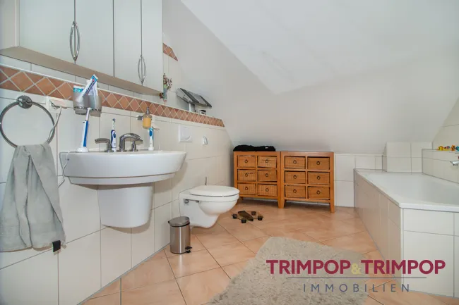 Bad: Das Gäste-WC im Erdgeschoss hat ein Fenster und ist mit einem WC und einem Waschbecken ausgestattet * Das Badezimmer im Dachgeschoss, ebenfalls mit Fenster, ist mit einer Dusche, einer Badewanne einem Waschbecken und einem WC ausgestattet *