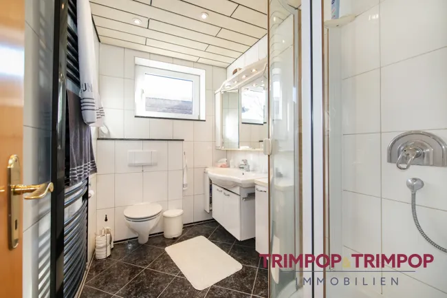 OG: Badezimmer von 1995 mit Handtuchheizung, Dusche + WC.