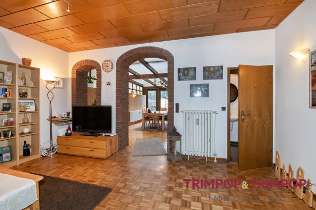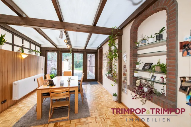 Highlight hier: ein großer Wintergarten, welcher momentan als Wohn- Essbereich genutzt wird. Von hier aus betreten Sie eine große Terrasse mit kleinem Garten.