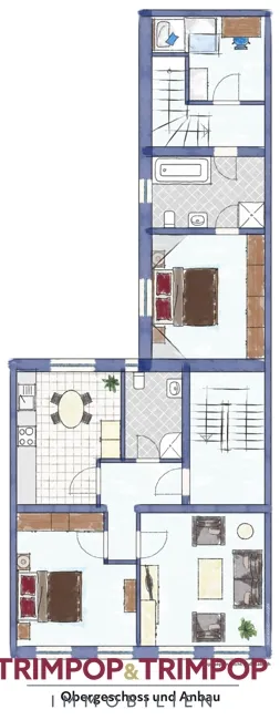 Wohneinheit im Erdgeschoss und im Anbau des 1. Obergeschoss: 5-Zimmerwohnung mit circa 94 Quadratmeter Wohnfläche, verteilt auf 2 Etagen.
