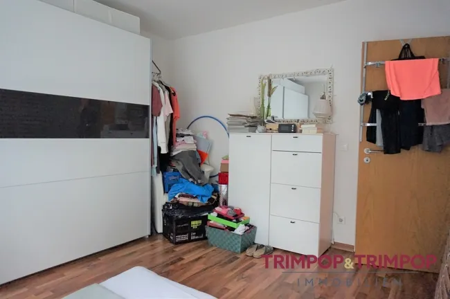 SO LEBEN SIE HIER: Die zwei Zimmer haben eine normale Ausstattung. Das Wohn-/Esszimmer ist geräumig, bietet mit ca. 27 m² ausreichend Platz für den Esstisch und die Wohnlandschaft, der Austritt auf den nach Westen ausgerichteten, überdachten Balkon ist inklusive.
