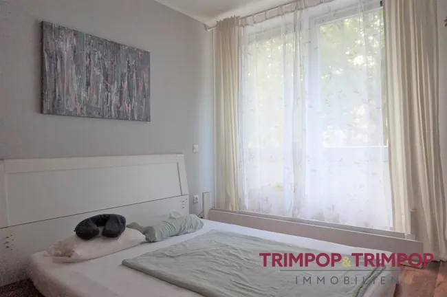 Im Schlafzimmer, ca. 14 m² groß und ebenfalls mit normaler Ausstattung, ist ausreichend Raum für Bett und Schrankwand, gerade Wände stellen hier kein Hindernis dar.