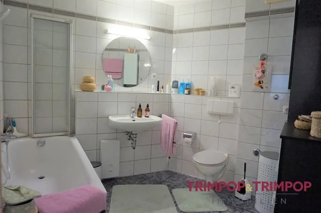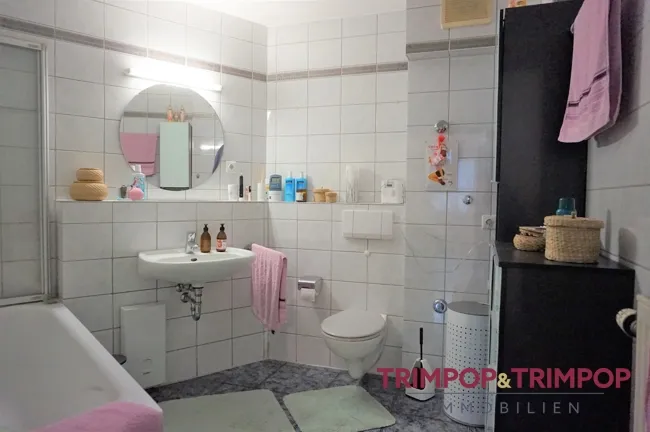 DAS BAD: Innenliegend und solide mit Badewanne inkl. Duschabtrennung, Waschbecken, WC und elektrischer Lüftung