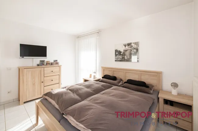 * Böden: weißer Fliesenboden im Flur, Wohn-Esszimmer, beiden Schlafzimmern und der Küche * anthrazitfarbener Fliesenboden mit weißem Fliesenspiegel im Bad *