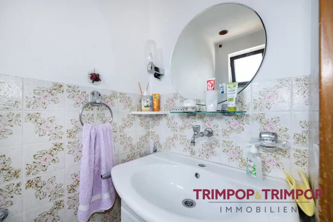 WELLNESS: Das weiß geflieste Tageslichtbad mit Badewanne, Waschbecken, Bidet und WC bietet alles, was man für die tägliche Pflege benötigt, entspricht jedoch nicht mehr den modernen Ansprüchen. Für die Gäste gibt es ein Gäste-WC, ebenfalls mit Fenster.