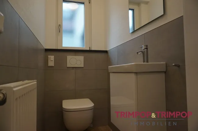 - hellgrauer Fliesenboden mit grauem Fliesenspiegel im Bad EG