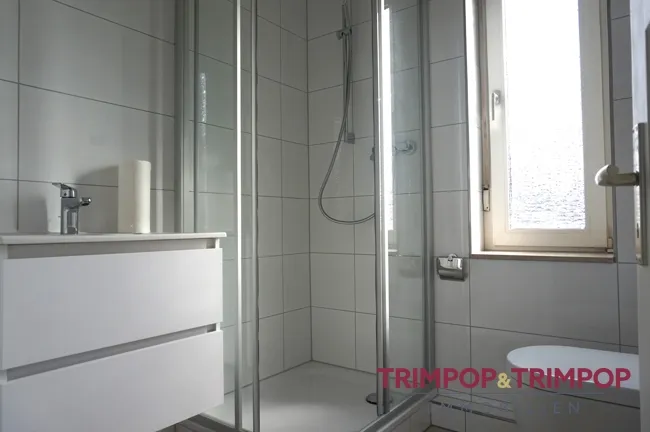 Im Tageslichtbad ist alles neu, eine fast bodentiefe Duschkabine, ein moderner Waschtisch, das WC und die praktische Handtuchheizung.