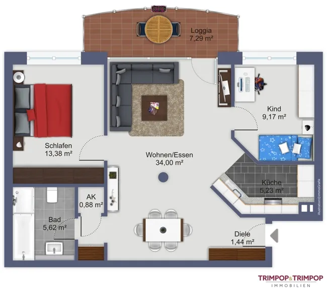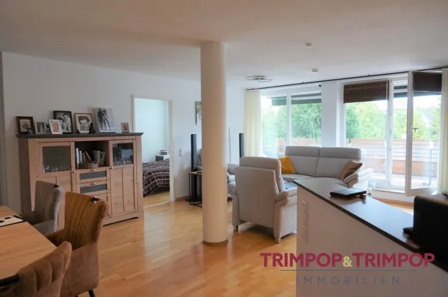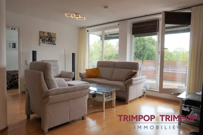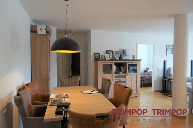 Auf insgesamt ca. 71 m² verteilen sich drei Räume zu einer harmonischen Einheit. Den Mittelpunkt bildet das große und lichtdurchflutete Wohn- und Esszimmer, wirklich ein Ort zum Entspannen und Wohlfühlen. Der Austritt auf die nach Südwesten ausgerichtete Loggia mit schattenspendender Markise ist inklusive. Im Wohnzimmer ist des weiteren eine Klimaanlage verbaut, die den Raum im Sommer angenehm kühlen wird. Links und rechts vom Wohn-/Esszimmer befinden sich die beiden Schlafräume, beide mit bodentiefen Fenstern und elektrischen Rollläden versehen. Das kleinere der beiden Zimmer kann alternativ auch als Homeoffice und/oder Gästezimmer genutzt werden. Ein kleiner Abstellraum bietet nützlichen Stauraum.