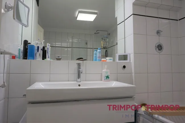 - dunkler Vinylboden in der Küche, im Bad weißer Fliesenboden mit weißem Fliesenspiegel