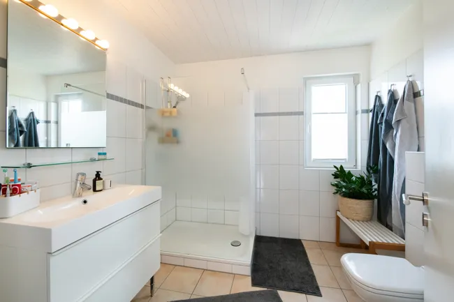 DAS BADEZIMMER mit Tageslicht hat eine große Dusche, ein WC und ein großes neues Waschbecken. Im Eingangsbereich finden Sie ein im Jahr 2016 erneuertes Gäste-WC.