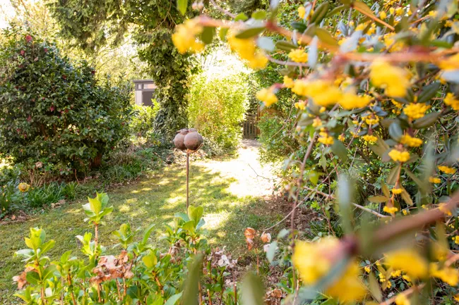 Ein pflegeleichter Garten mit zwei Terrassen und einem gemeinsamen Brunnen zur Bewässerung.