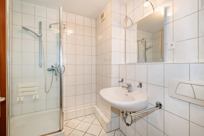 Das Erdgeschoss bietet ein Bad mit Dusche, Waschbecken und WC. Im Obergeschoss befindet sich ein weiteres Duschbad mit WC und Waschbecken.