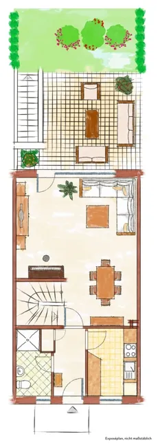 Mit zwei Bädern – einer Dusche im Erdgeschoss und einem Duschbad im Obergeschoss – gehören morgendliche Wartezeiten der Vergangenheit an. Der großzügige Keller bietet zusätzlich Stauraum sowie einen Hobbyraum, einen Waschkeller und einen Vorratsraum. Über die Außentreppe gelangen Sie direkt in den Garten, der zum Spielen und Entspannen einlädt. Zwei Terrassen – eine direkt am Wohnzimmer und eine am Ende des Gartens – bieten tolle Plätze für sonnige Nachmittage oder ein Frühstück im Freien. Das Gartentörchen und die Bewässerung durch den gemeinsamen Brunnen machen den Gartenbereich besonders praktisch und charmant.