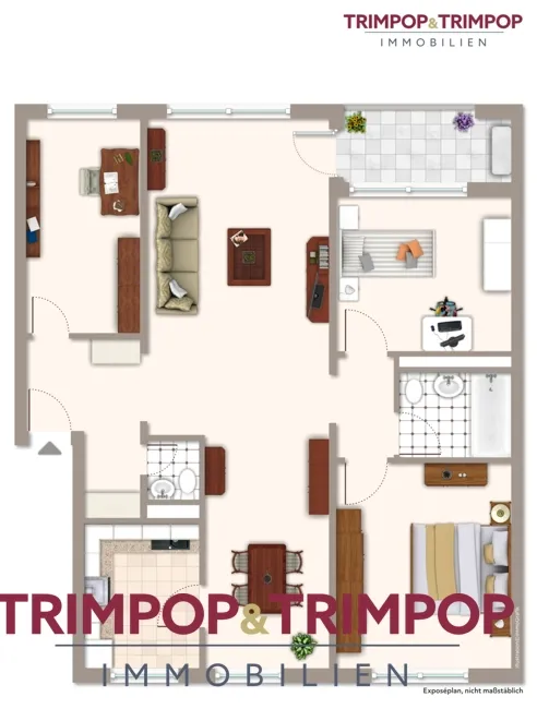Empfangen werden Sie von einer geräumigen Diele inkl. Einbauschrank und Platz für Schuhe und Garderobe so wie Zugang zum Gäste-WC. Gegenüber der Eingangstüre liegt das erste Zimmer, welches sich idealerweise als Büro bzw. Gästezimmer eignet. Der nächste Raum ist das großzügige, offene Wohn-/Esszimmer. Fenster auf beiden Kopfseiten lassen viel Licht herein und verleihen dem Raum eine luftige und helle Atmosphäre. Vom Wohnbereich aus haben Sie auch Zutritt auf die nach Süden ausgerichtete Loggia mit kleinem Abstellraum. Angrenzend an den Essbereich befindet sich die praktisch geschnittene Küche. Die auf den Bildern ersichtliche Küche inkl. Einbaumöbel und Elektrogeräte, welche vor 2 Jahren neu eingebaut wurde, wird für 40 € monatlich angemietet.