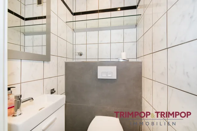 DIE BÄDER: Sie haben richtig gelesen! Es gibt sowohl das Hauptbad, innenliegend und in 2024 komplett saniert, mit bodentiefer Dusche inkl. Glas-Spritzschutz, Waschbecken und WC, auf der rechten Seite des Flures gelegen, als auch ein Gäste - WC. Dies befindet sich auf der gegenüberliegenden Seite.