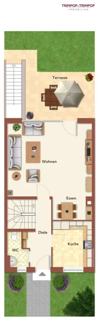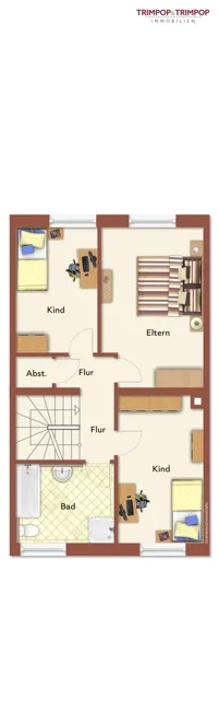 Raumaufteilung: * Erdgeschoss: Wohnen-Essen, Küche, Diele, Gäste-WC * Obergeschoss: 3 Schlafzimmer *