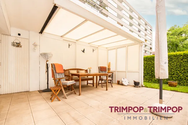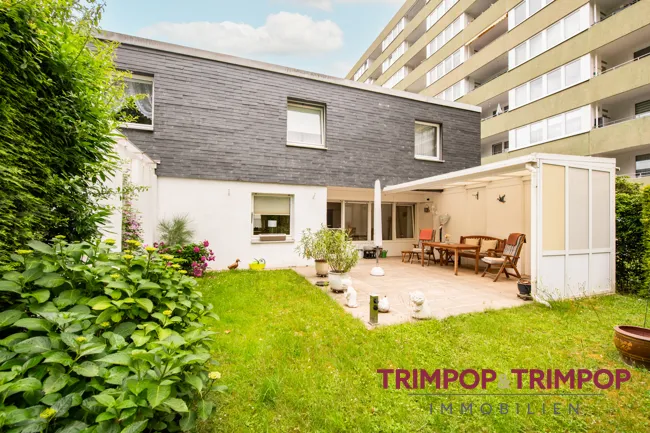 * Terrasse mit Pergola und kleinem Garten in Nordostausrichtung, kleiner Abstellraum