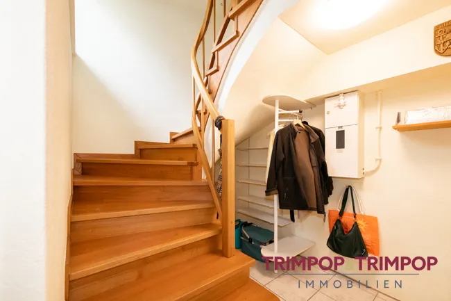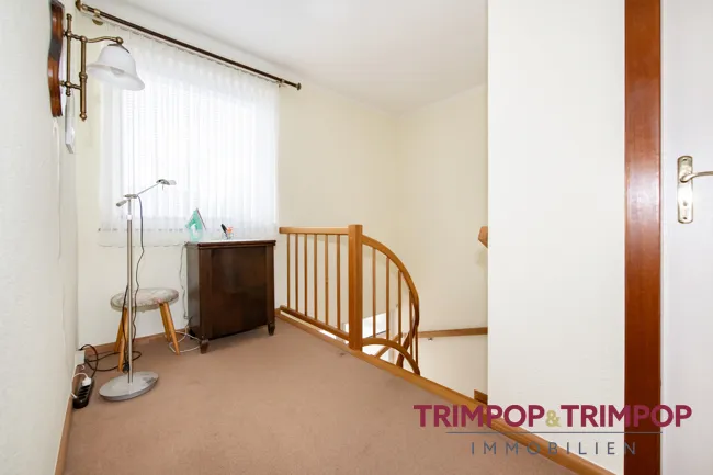 Fenster in allen Räumen lassen viel Licht herein und verleihen den Räumen in Verbindung mit dem im Wohn-/Essbereich ausgelegten Parkett eine gemütliche Atmosphäre. Vom Wohnraum aus haben Sie auch Zugang zur mit einer Pergola teilüberdachten Terrasse und in den kleinen Garten. Über eine tolle Echtholztreppe gelangen Sie ins Obergeschoss. Hier finden Sie eine klassische Aufteilung; ein geräumiger Flur, drei Zimmer, wovon eines mit Sicherheit Ihr neues Schlafzimmer wird, die weiteren Räume eignen sich idealerweise als Kinderzimmer und/oder Gästezimmer bzw. Büro, das Tageslichtbad und ein Abstellraum. Was braucht die kleine Familie mehr, um glücklich zu sein?