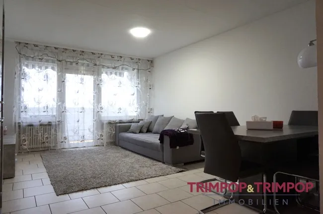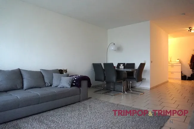 Das Wohn-Esszimmer ist lichtdurchflutet und wartet auf Ihre Einrichtungsideen. Vom Wohnzimmer aus haben Sie noch mehr Sonne, da wartet nämlich der große Süd-Balkon. Plus: Die grün-weiß gestreifte Markise (Handkurbel) ist ein willkommener Schattenspender.