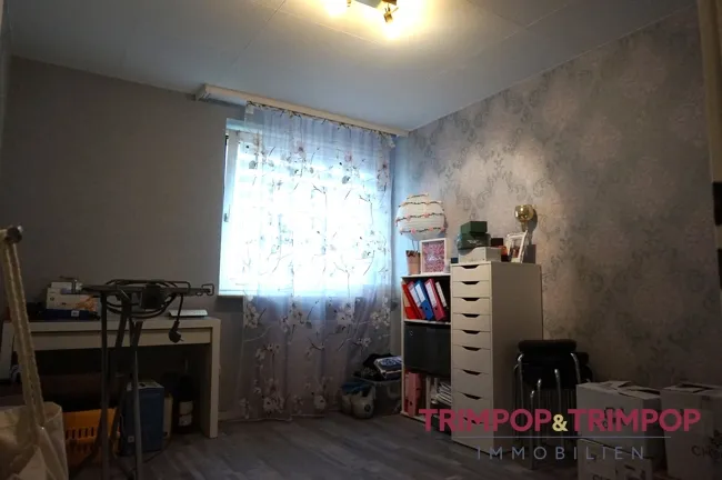 - in Wohn-Esszimmer, Diele und Küche heller Fliesenboden, im Schlafzimmer hochwertiger Laminatboden in Holzoptik, grauer Laminatboden im Büro/Gästezimmer